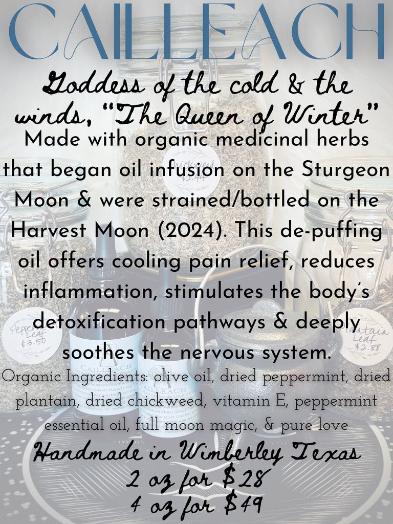 This cooling oil is infused with full moon magic, peppermint, chickweed, and plantain for wound healing, cooling the body, and relieving both topical and internal pain. The organic herbs began giving their medicine to the organic olive oil on the Sturgeon Moon in the Lion's Gate Portal and they were strained during the total lunar eclipse on the Full Blood Corn Moon (2025). Other ingredients include Vitamin E to preserve freshness and a few drops of organic peppermint essential oil to enhance the scent. Keep out of direct sunlight.