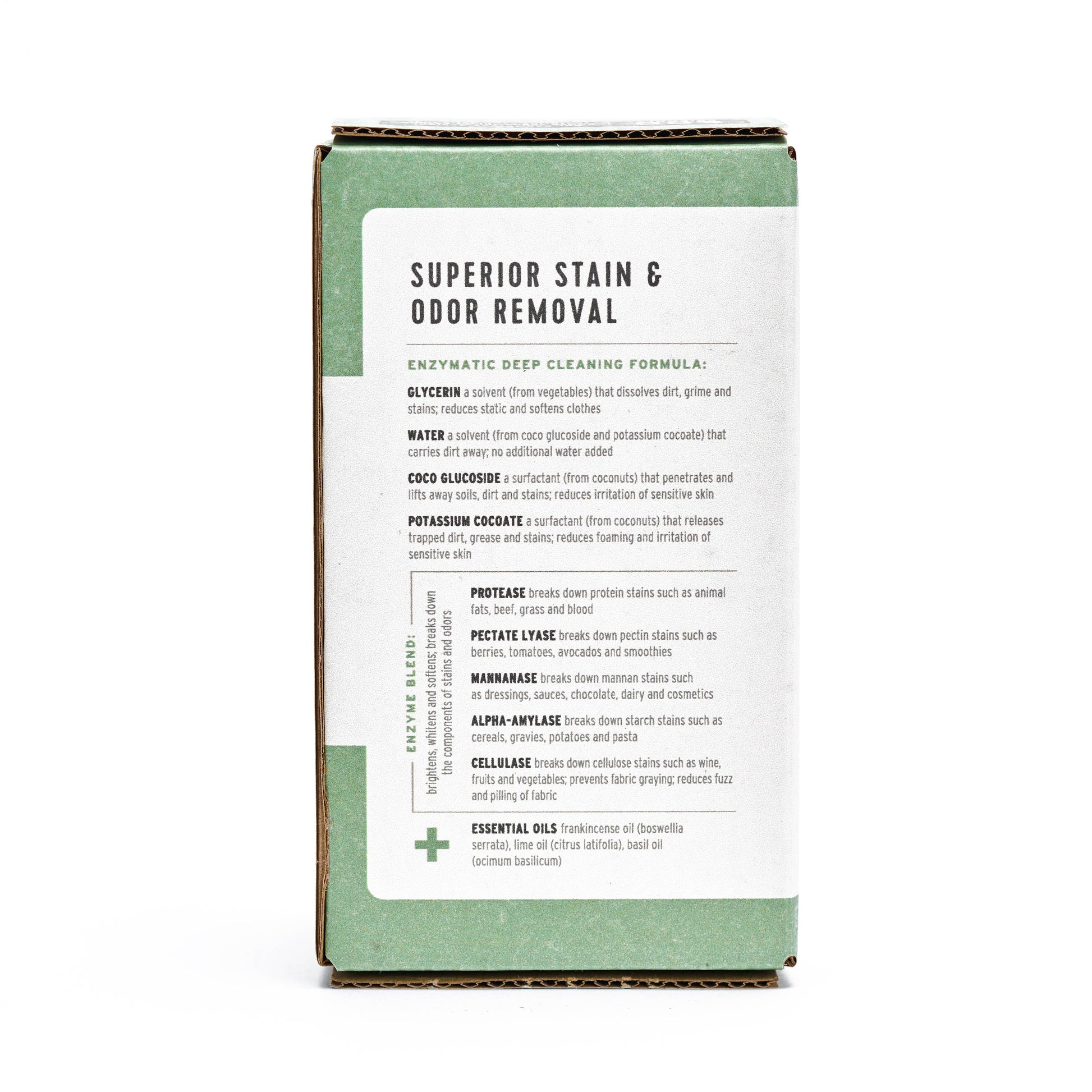 Our laundry detergent uses nature’s most powerful bioactive ingredients for a safe + effective clean. The powerfully effective, all natural ingredients provide a premium, enzymatic deep clean, going beneath the surface fibers and removing all stains and odors.