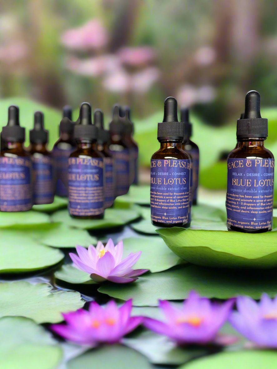 Ingesting half to two droppers of this elixir may reduce stress, anxiety, and inflammation while enhancing dreams, ceremonies, sexual desire, sleep quality, and skin radiance. Some people love Blue Lotus because they claim it can stabilize menstrual cycles, control blood sugars, improve digestion, increase blood circulation, and support mental health.