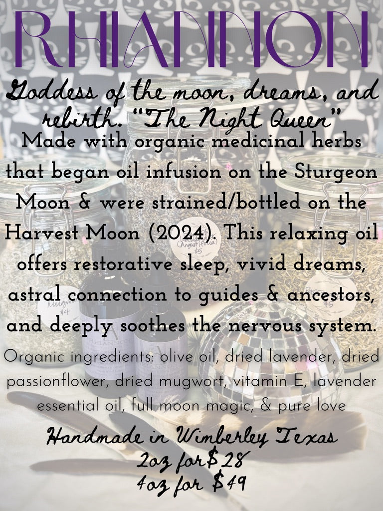 This bedtime oil is infused with full moon magic, lavender, passionflower, and mugwort for relaxation, nervous system regulation, deeply restorative sleep and vivid dreaming. The organic herbs began giving their medicine to the organic olive oil on the Sturgeon Moon in the Lion's Gate Portal and they were strained during the total lunar eclipse on the Full Blood Corn Moon (2025). Other ingredients include Vitamin E to preserve freshness and a few drops of organic lavender essential oil to enhance the scent. Keep out of direct sunlight.